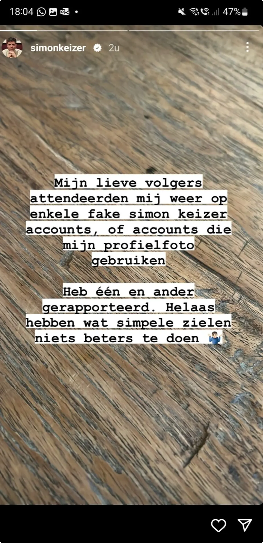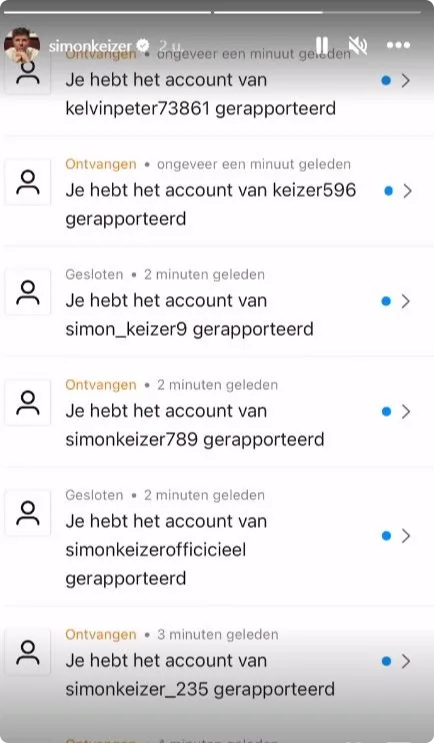 Hij laat in zijn Instagram Stories weten dat hij er door een aantal fans is op geattendeerd en daar is hij iedereen erg dankbaar voor. Hij heeft de nepaccounts inmiddels gerapporteerd, zegt hij ook.