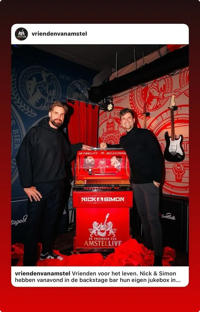 Woensdagavond was er nog een bijzonder moment voor de zanger, want Nick & Simon waren toen weer even herenigd. Ze hadden aan de vooravond van De Vrienden van Amstel LIVE hun eigen jukebox gekregen.
