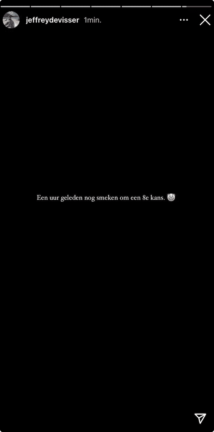 Jeffrey plaatst een klein uur later een storie op zijn Instagram. "Een uur geleden nog smeken om een 8e kans", schrijft hij erbij. Hierbij lijkt hij te hinten op de eerdere post van Gordon.
