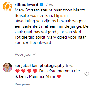 Dit doet ze onder een bericht op Instagram van RTL Boulevard. "Mary Borsato steunt haar zoon Marco Borsato waar ze kan", kopt het nieuwsplatform. Sonja reageert op dit bericht met: "De liefste mamma die ik ken. Mamma Mimi."