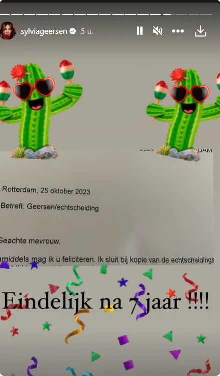 De scheiding van Sylvia Geersen (zie video) is na zeven jaar rond. Dat deelt het 38-jarige model donderdag in haar Instagram Stories.