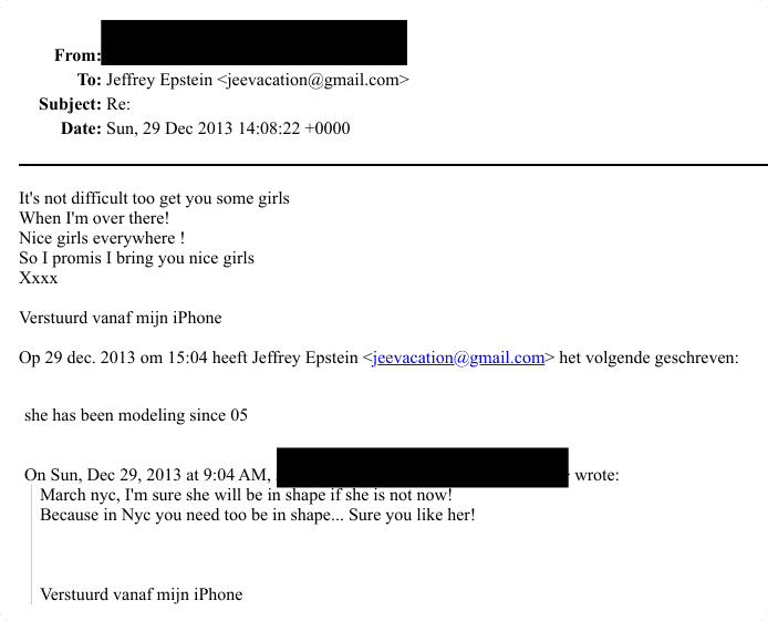 Sylvia en Jeffrey hadden dus meermaals contact over meisjes, waar dit precies om ging is vooralsnog niet duidelijk. "Het is niet moeilijk om wat meisjes voor je te regelen als ik daar ben! Overal leuke meisjes! Dus ik beloof je leuke meisjes", is afkomstig uit een mailtje van Sylvia naar Jeffrey uit december 2013. Zie onderstaande foto voor meer.
