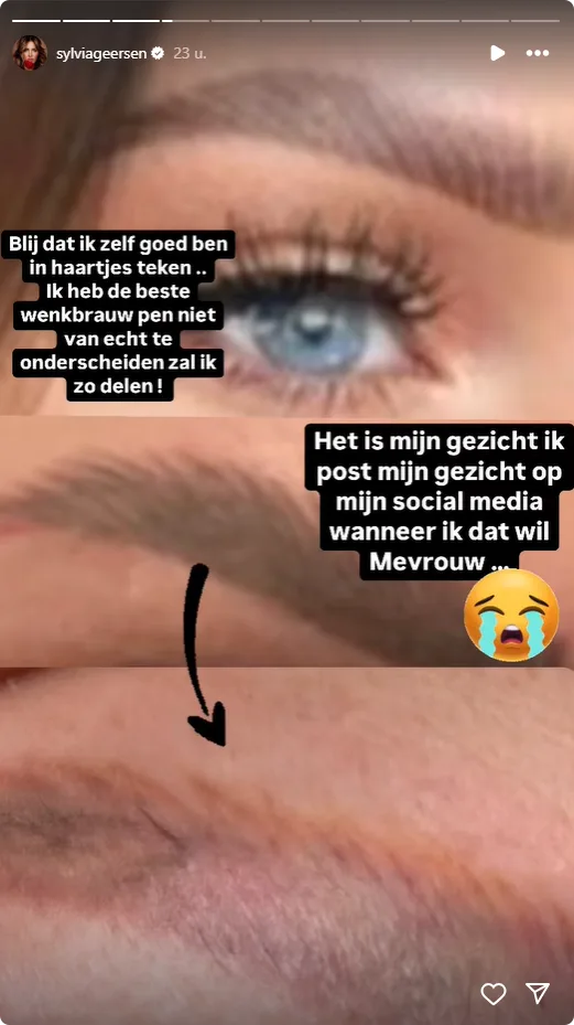 De gevolgen zijn voor Sylvia behoorlijk heftig, vooral omdat haar wenkbrauwspecialist de fout lijkt te ontkennen. "De eigenaresse lijkt te ontkennen dat dit door het laseren komt. Maar mijn haartjes zijn nu wel vernietigd", vervolgt ze gefrustreerd. Sylvia laat het er niet bij zitten en wil vooral haar volgers waarschuwen. "Dit is pure verminking."