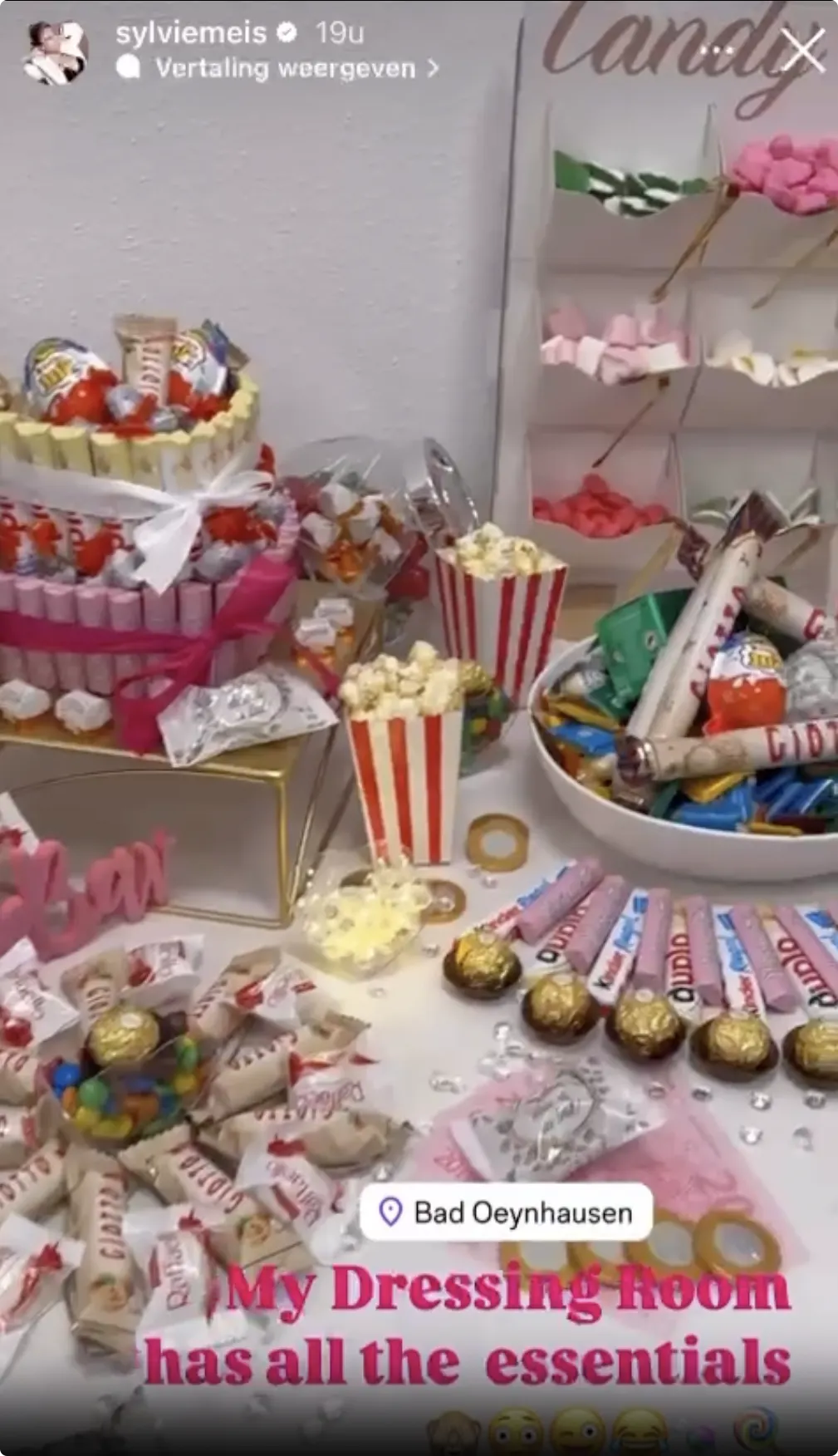 "Mijn kleedkamer heeft alle benodigdheden", schrijft ze bij een filmpje. Eén ding is zeker: Sylvie hoeft geen honger te hebben voor ze aan de klus begint, want haar kamer ligt bomvol lekkernijen. Zo ligt er een lading aan chocolade, bakjes popcorn én staat er een koelkastje met frisdrank. De presentatrice schrijft er niet bij voor welke baan het is, maar het zal vast een tv-klus zijn, ergens in Duitsland.