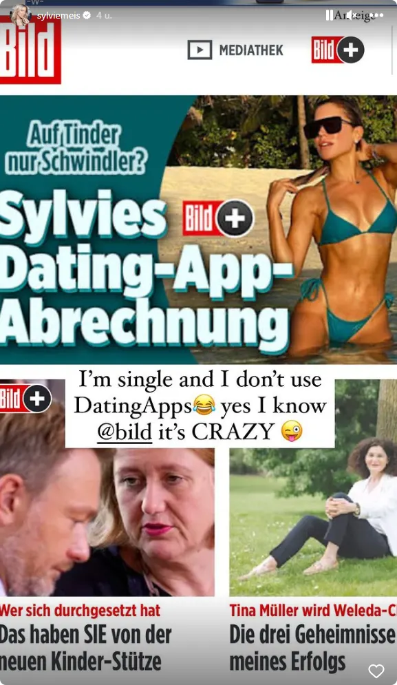 Op haar Instagram Stories deelt Sylvie een foto van de website van Bild, waarbij ze schrijft: "Ik ben single en ik gebruik geen dating-apps. Ja, ik weet het Bild, het is CRAZY!"