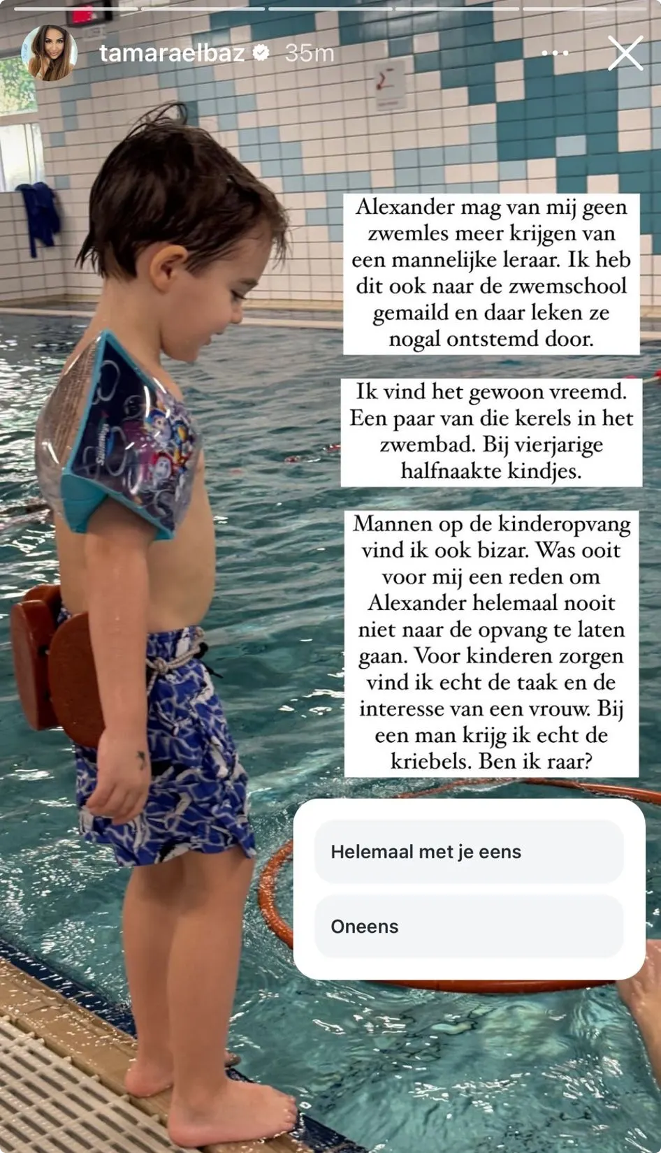 "Alexander mag van mij geen zwemles meer krijgen van een mannelijke leraar. Ik heb dit ook naar de zwemschool gemaild en daar leken ze nogal ontstemd door", schrijft Tamara in de Story.