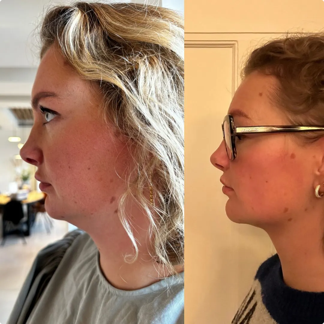 Daarna deelde ze een foto van haar kin voor de operatie en een foto van haar kin na de operatie. Ze vertelde dat ze enorm blij is met het resultaat. Je ziet het hieronder...