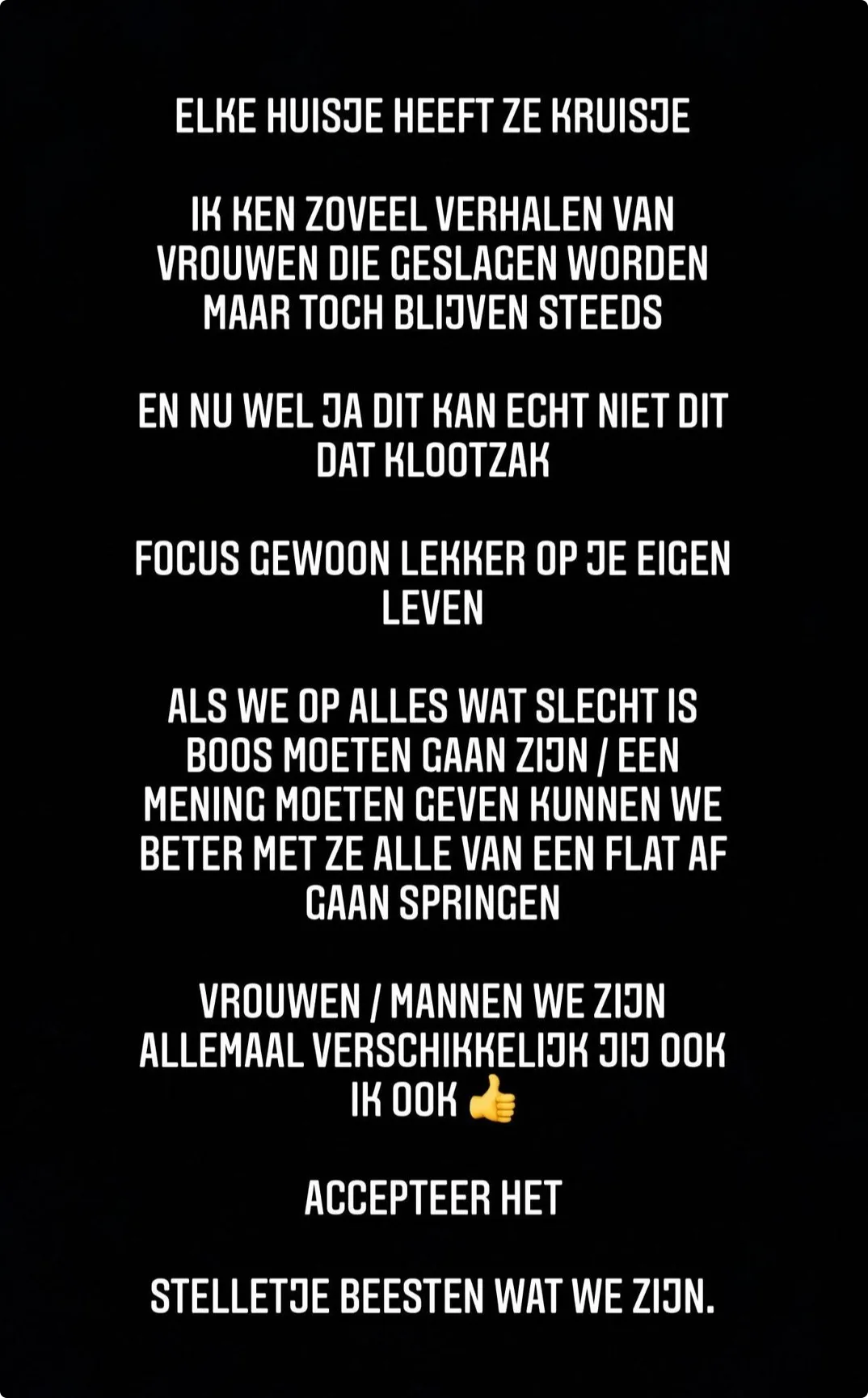 Even voor álle duidelijkheid: wat een vrouw ook tegen je zegt, en hoe kwaad ze je ook maakt, fysiek blijf je ten allen tijde met je poten van haar af. Ik was echt in shock na het zien van deze beelden, wat een disrespect naar in het algemeen de vrouw, maar in dit geval naar de moeder van je kind. Kappen man..."