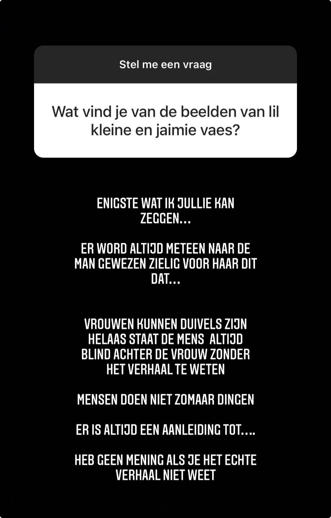 Ook Miljuschka reageerde op haar Instagram Stories. "Mijn maag draaide net om bij het kijken van de beelden bij LifeOfYvonne. Een heftige mishandeling van Jaimie Vaes door Lil' Kleine. We kunnen dit niet ontzien. Vorige keer wisten we het. Maar hadden we geen beelden van het moment. Nu zien we het. Ik hoop zo dat dit goed en snel eindigt. Want dit is niet ok."