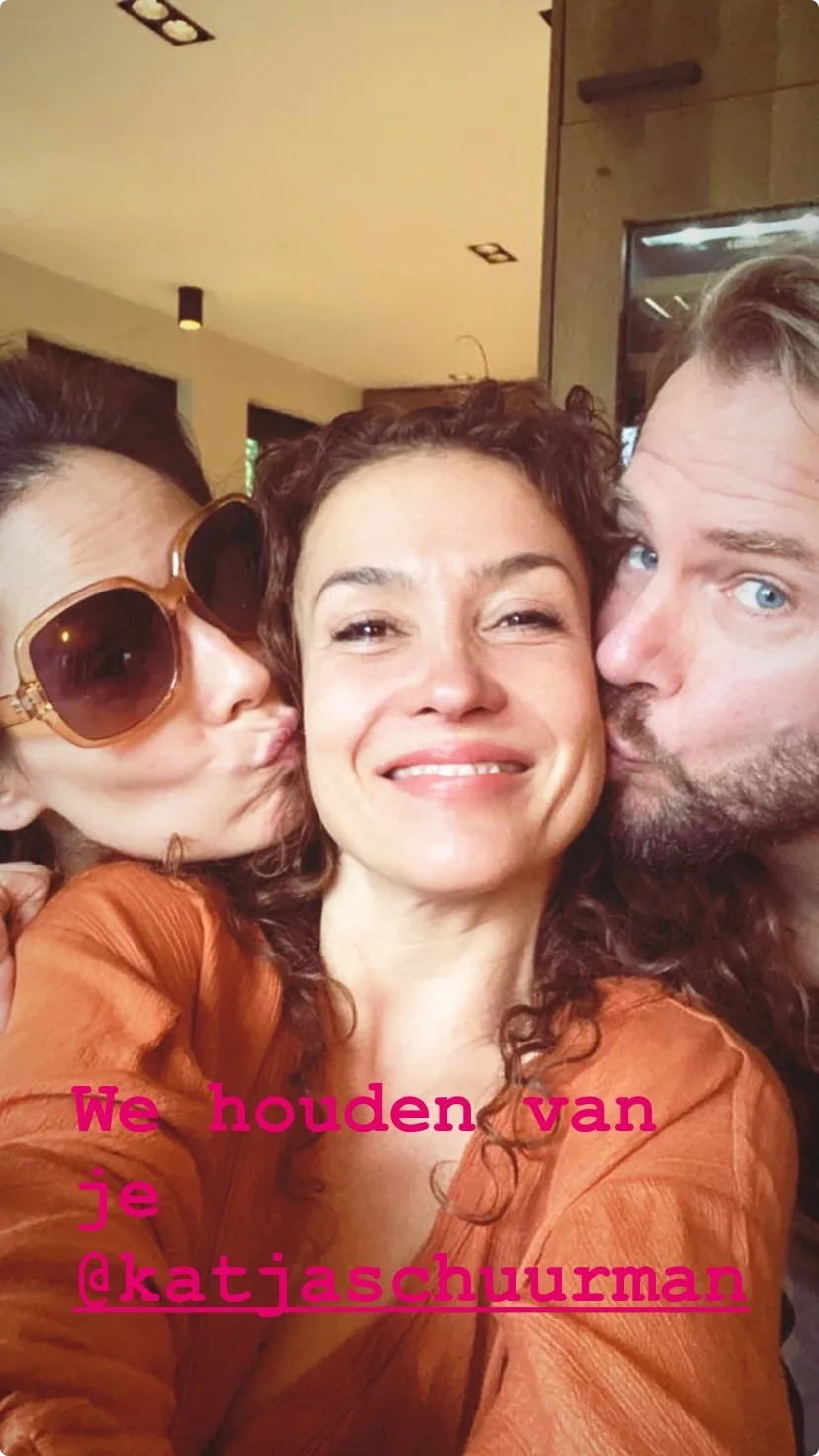 "We houden van je Katja", staat er bij de foto die ze deelt op een instagram story om Katja Schuurman te feliciteren met haar 48e verjaardag. Igone en Thijs geven de actrice allebei een kus op de wang. Katja en Thijs zijn nog altijd goed bevriend met elkaar na hun scheiding. Onduidelijk is of of Igone en Thijs nog on speaking terms zijn na het aangekondigde einde van hun relatie. Onderstaand beeld zou bovendien kunnen gaan om een oude foto van het voormalige stel.