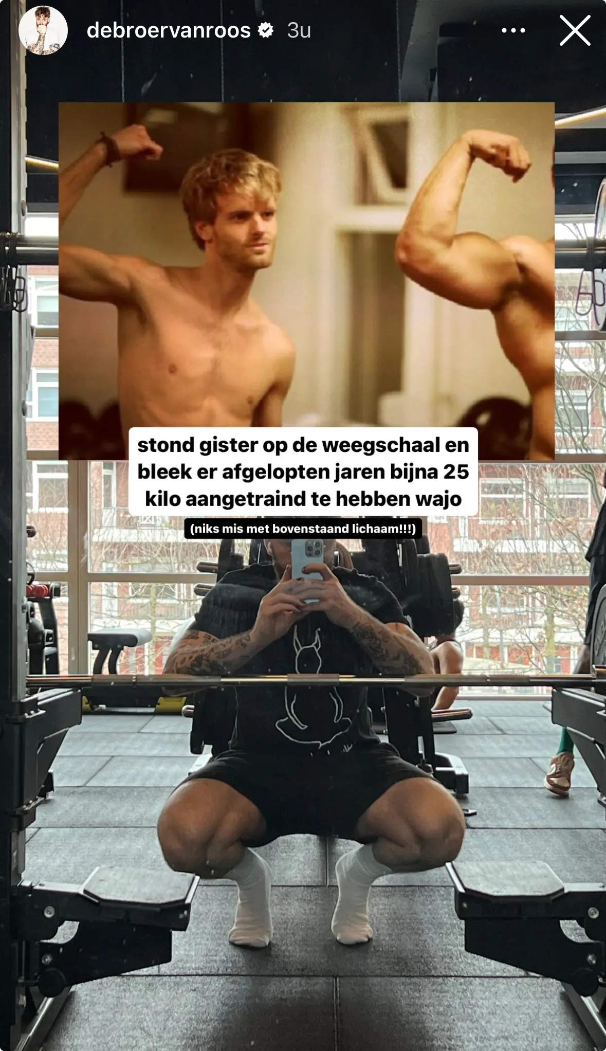 "Stond gister op de weegschaal en bleek er afgelopen jaren bijna 25 kilo aangetraind te hebben", zo schrijft Tim in zijn Instagram Stories. Hij deelt ook een foto van hem waarin hij een stuk jonger en dus ook dunner is.