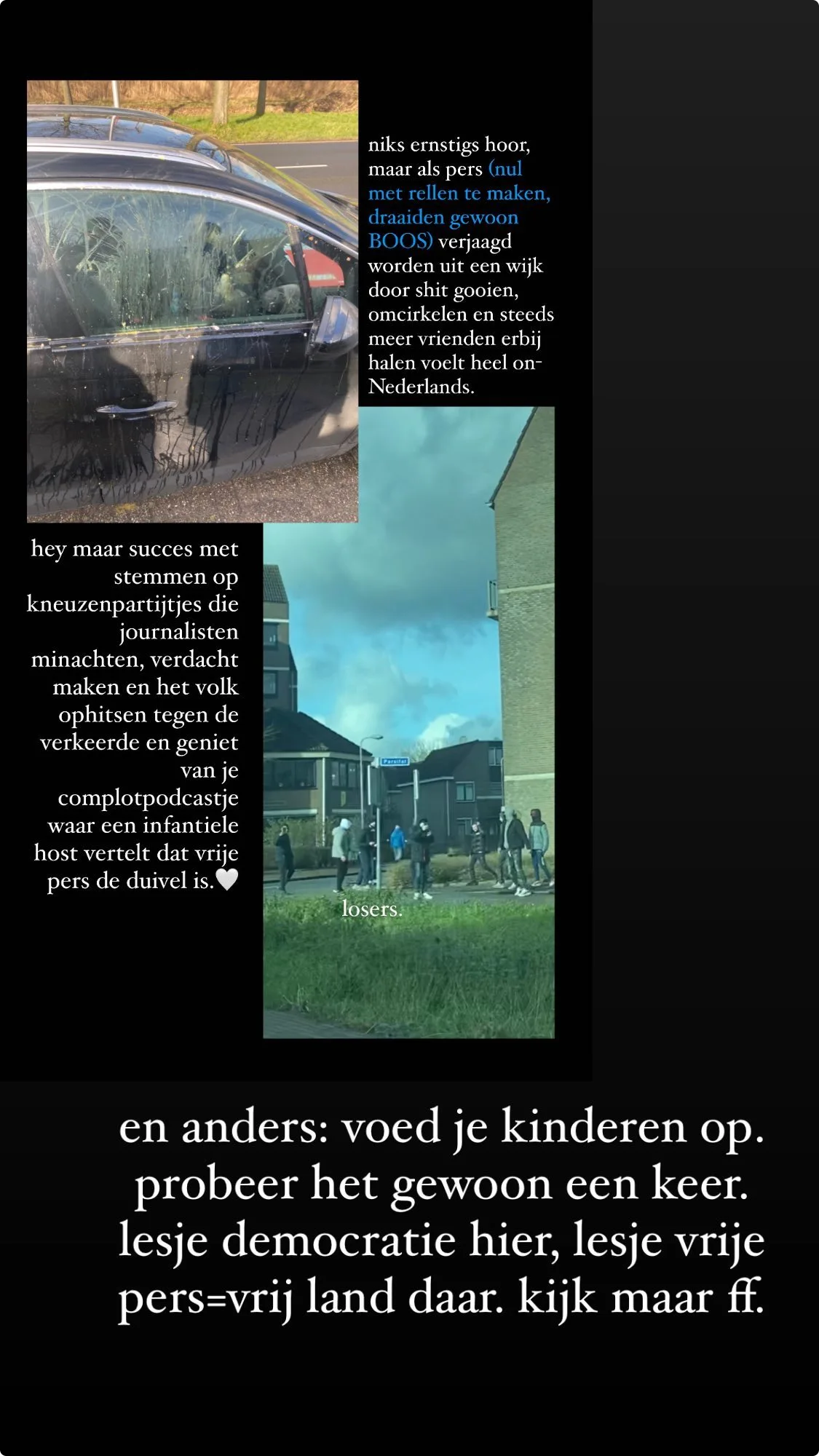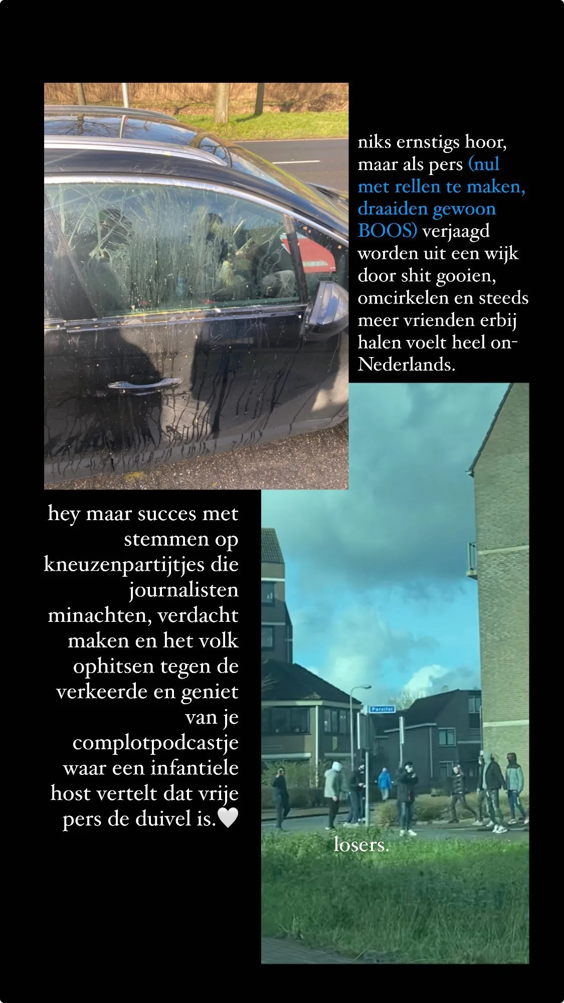 Zo deelt hij enkele foto's in zijn Instagram Stories waarop onder andere is te zien hoe zijn auto is bekogeld met eieren. "Hey, maar succes met stemmen op kneuzenpartijtjes die journalisten minachten, verdacht maken en het volk ophitsen tegen de verkeerde en geniet van je complotpodcastje waar een infantiele host vertelt dat vrije pers de duivel is."