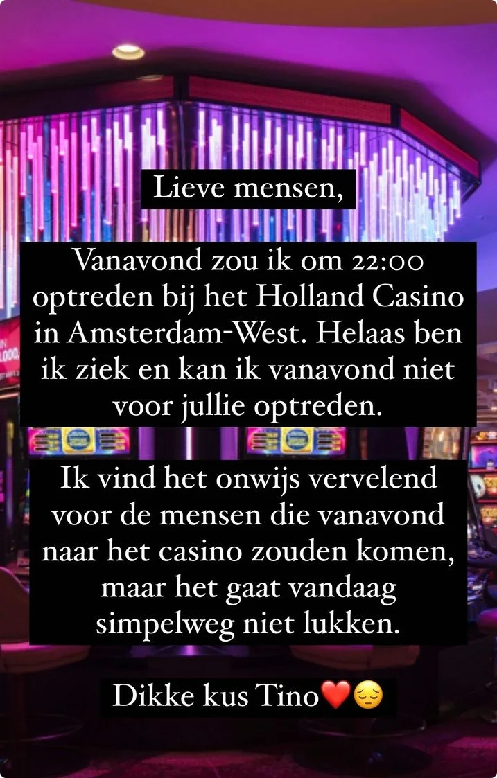Tino Martin, die onlangs nog Lil Kleine uitnodigde als gastartiest (zie video), moet vrijdagavond een optreden in het Holland Casino in Amsterdam-West afzeggen omdat hij ziek is. Dat nieuws deelt de 39-jarige artiest via Instagram Stories.