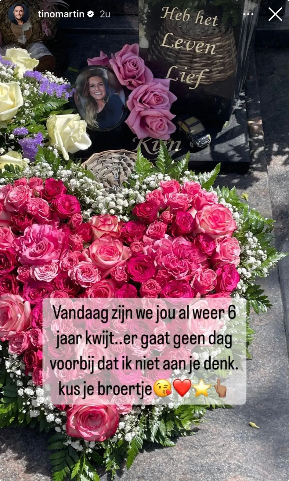 De zanger deelt een foto bij haar herdenkingsplek, waar een enorme bos rozen in de vorm van een hart ligt. "Vandaag zijn we jou alweer zes jaar kwijt... Er gaat geen dag voorbij dat ik niet aan je denk", zegt hij. Ook heeft hij nog een boodschap aan zijn volgers: "Kus je broertje."