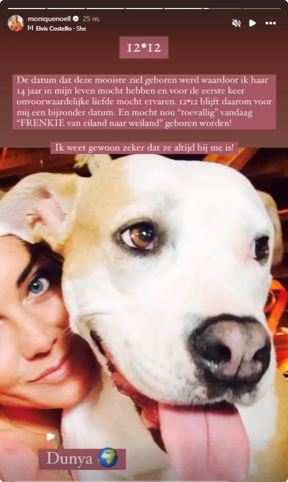 In haar Instagram-Story deelt ze een foto van Dunya met een ontroerende tekst: "12-12, de datum waarop deze mooiste ziel werd geboren. Dankzij haar mocht ik 14 jaar onvoorwaardelijke liefde ervaren. 12-12 blijft voor mij een bijzondere datum. Ik weet zeker dat ze altijd bij me is!"