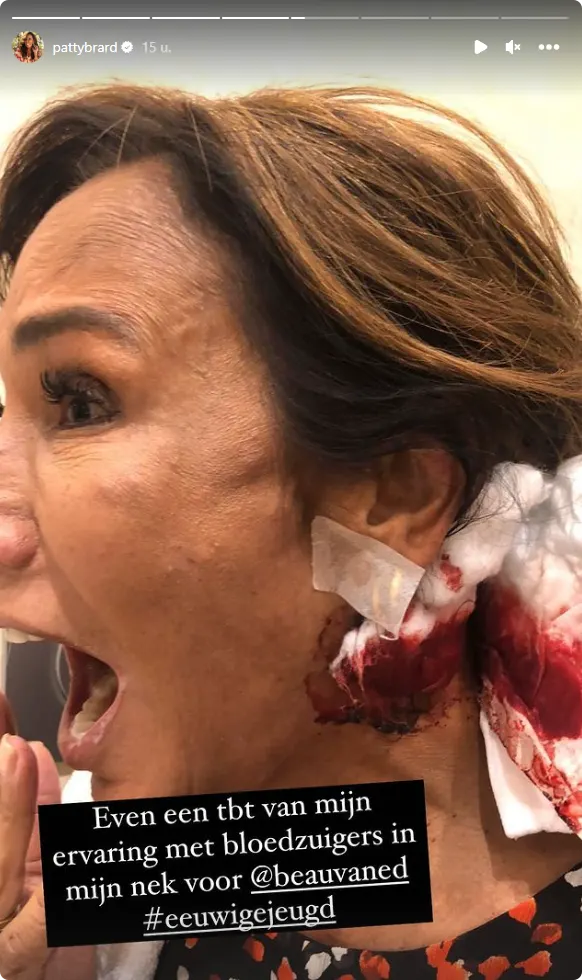 "Even een terugblik op mijn ervaring met bloedzuigers in mijn nek voor Beau van Erven Dorens #eeuwigejeugd", schrijft Patty op instagram als reactie op het nieuws dat Beau in zijn RTL4-talkshow zelf ook live een bloedzuiger op zijn arm kreeg.