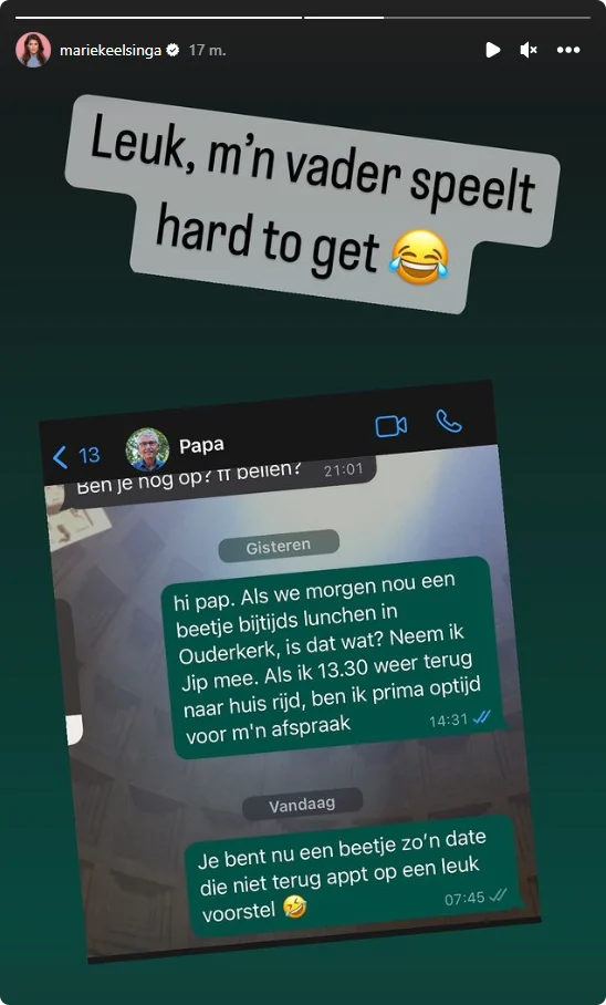 De vader van Marieke Elsinga (36) reageert niet op de berichtjes van zijn dochter. Dat vertelt Marieke op instagram. "Leuk, m'n vader speelt hard to get"