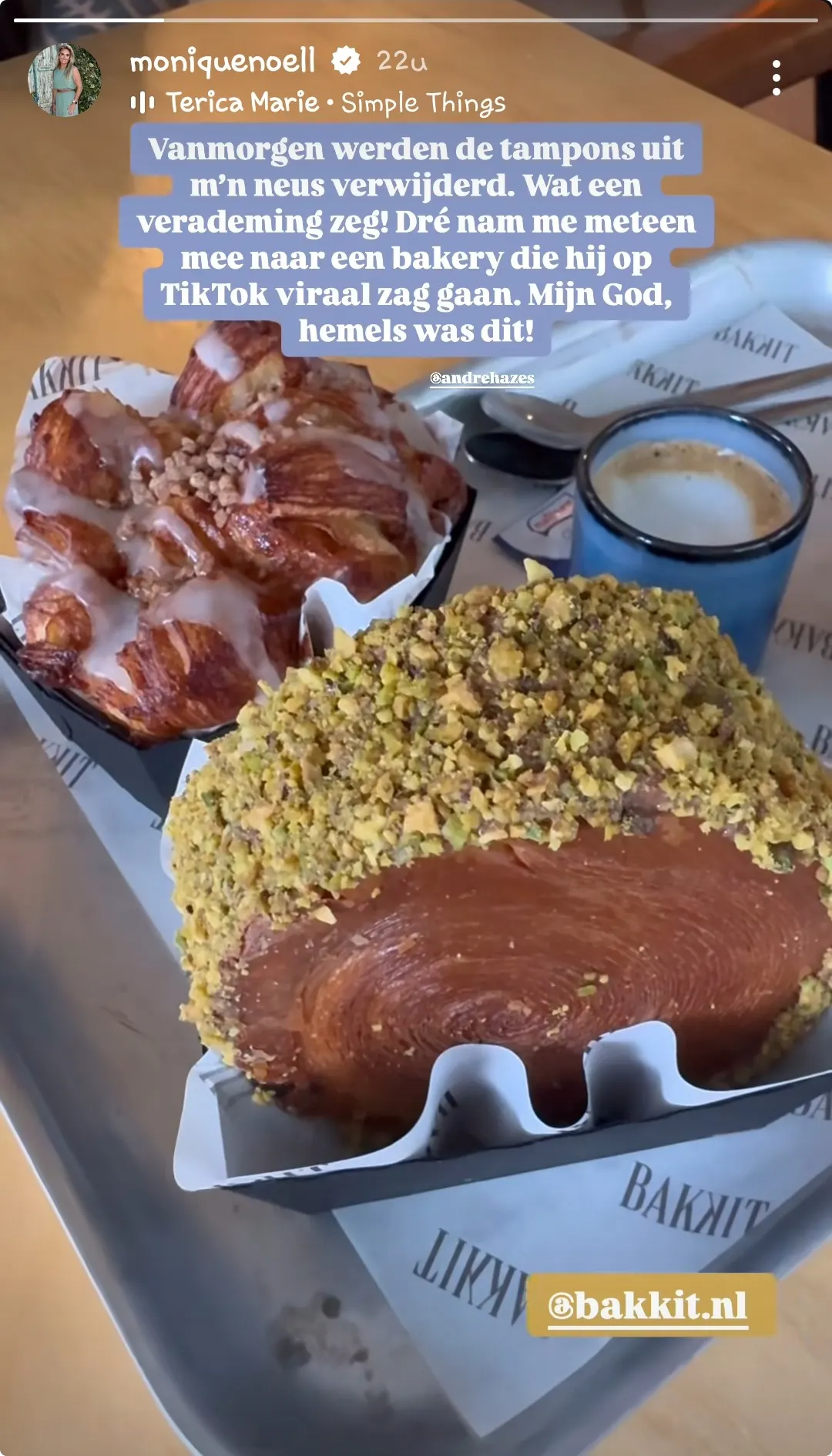 In het ziekenhuis kreeg Monique namelijk speciale tampons in haar neus. Een aantal dagen later zijn die eindelijk verwijderd. "Vanochtend werden de tampons uit mijn neus verwijderd", laat Monique disndag op Instagram Stories weten. "Wat een verademing zeg! Dré nam me meteen mee naar een bakery die hij op TikTok viraal zag gaan."