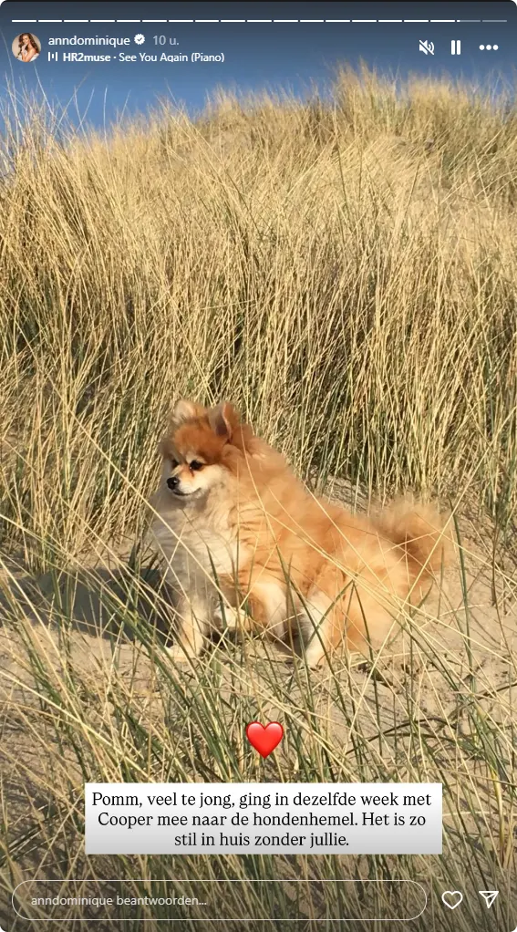 "Pomm, veel te jong, ging in dezelfde week met Cooper mee naar de hondenhemel. Het is zo stil in huis zonder jullie", schrijft Ann Dominique bij een foto van de pomeriaan.