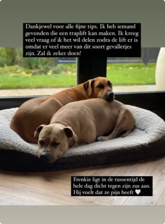 Eerder op maandag schreef Monique wanhopig op Instagram dat het niet goed gaat met haar 6-jarige hond Gioia. Ze liet emotioneel weten dat Gioia weer heel slecht loopt. "Iedere dag de trap op en af tillen is voor mijn rug ook niet bevorderlijk (...) Iemand die een trapliftje kan maken of andere tips? Dit is geen grap, want ze slaapt naast me en wil ik ook zo houden."