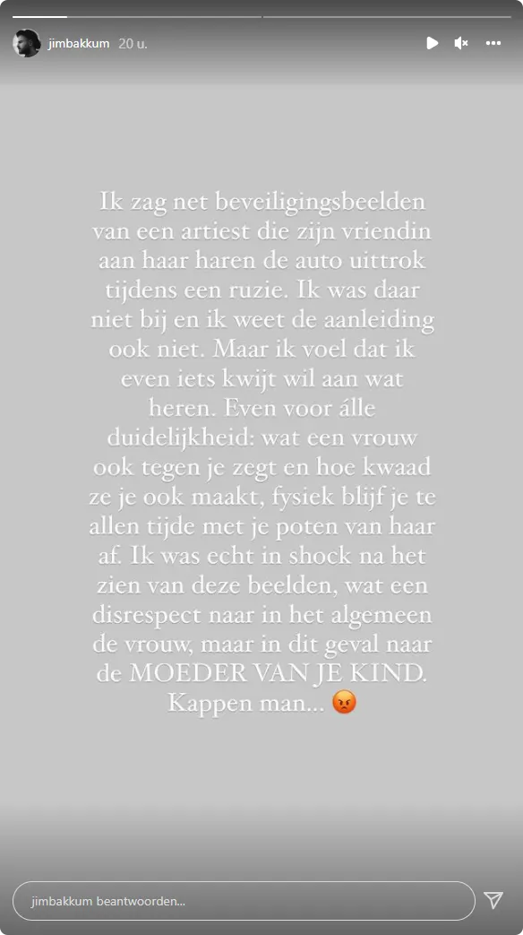 Ook Jim Bakkum liet zich uit op zijn Instagram Stories: "Ik zag net beveiligingsbeelden van een artiest die zijn vriendin aan haar haren de auto uittrok tijdens een ruzie. Ik was daar niet bij en ik weet de aanleiding ook niet. Maar ik voel dat ik even iets kwijt wil aan wat heren.
