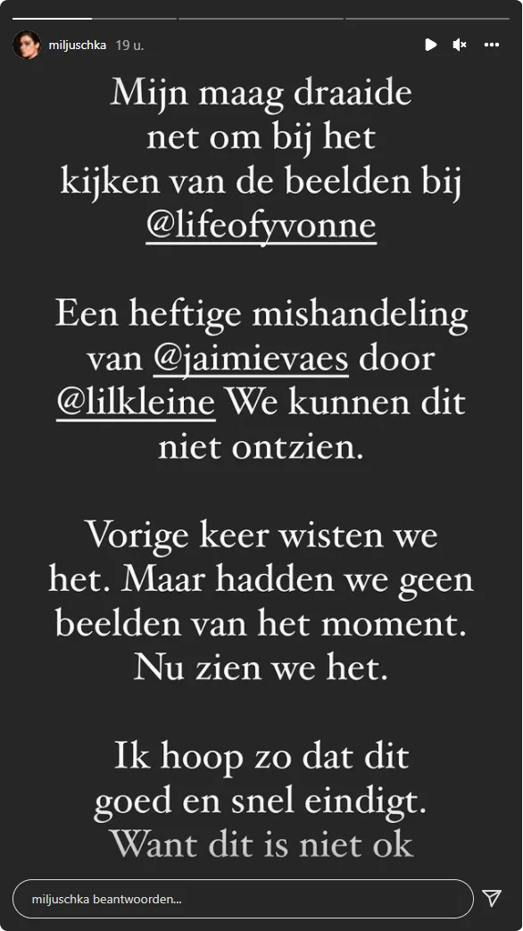 Ook Miljuschka reageerde op haar Instagram Stories. "Mijn maag draaide net om bij het kijken van de beelden bij LifeOfYvonne. Een heftige mishandeling van Jaimie Vaes door Lil' Kleine. We kunnen dit niet ontzien. Vorige keer wisten we het. Maar hadden we geen beelden van het moment. Nu zien we het. Ik hoop zo dat dit goed en snel eindigt. Want dit is niet ok."
