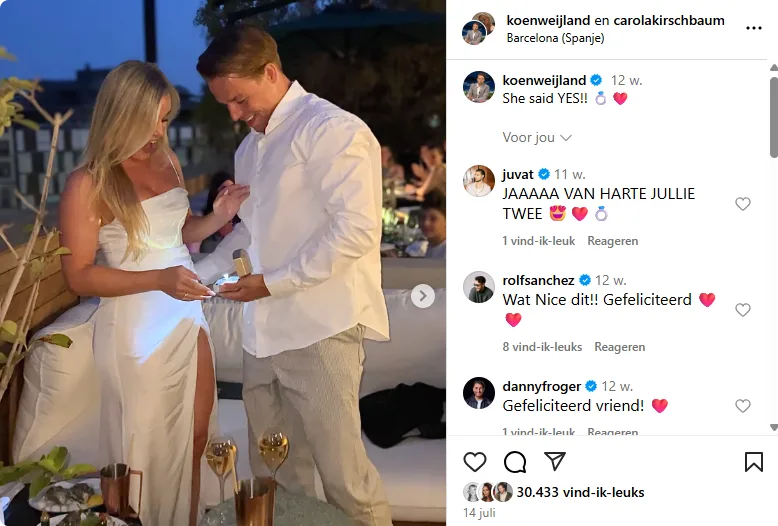 Dat klopt, want Koen is sinds juli jongstleden verloofd met zijn grote liefde Carola Kirschbaum. Eerder dit kalenderjaar had zij nog een miskraam. In een openhartig interview met De Telegraaf vertelde Koen over de emotionele periode. "Het was heel zwaar, vooral voor haar. We zaten nog in een redelijk vroeg stadium, maar het hakte er flink in." De miskraam vond plaats vlak voordat Koen Carola ten huwelijk wilde vragen. Daarom besloot hij het aanzoek even uit te stellen. "Nu zijn we verloofd." Toch staat trouwen nog niet bovenaan hun lijstje. "We willen eigenlijk eerst wachten tot het ons lukt om alsnog zwanger te worden. Er is absoluut geen haast."