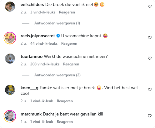 In de reacties gaat het echter niet over haar tatoeages, maar uitsluitend over haar broek. "Werkt de wasmachine niet meer?", schrijft iemand. Anderen vragen zich af of ze is gevallen. "Heb je in de modder liggen rollen?", vraagt iemand anders zich af.