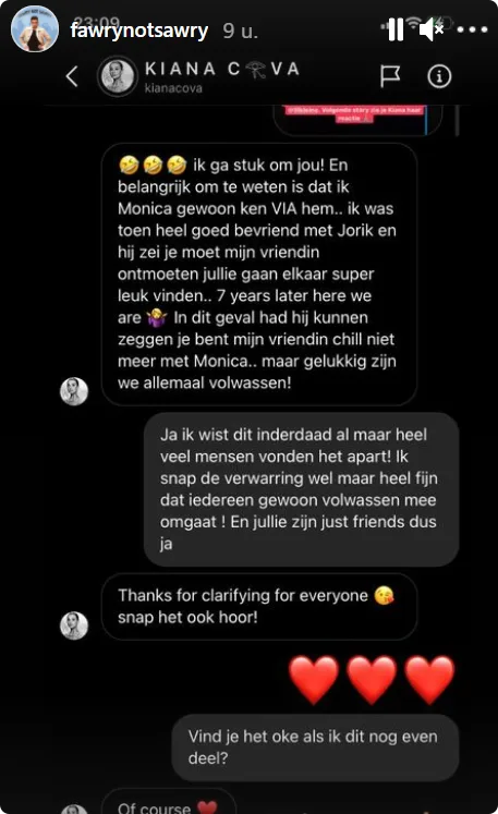 Tegen het bekende Instagramaccount FawryNotSawry verduidelijkt ze: "Belangrijk om te weten is dat ik Monica ken VIA hem. Ik was toen heel goed bevriend met Jorik en hij zei: 'je moet mijn vriendin ontmoeten, jullie gaan elkaar superleuk vinden.'"