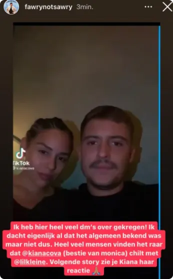 Kiana reageert hierop en wil voor eens en altijd uitsluitsel geven. "Voor de laatste keer: IK KEN MIJN BESTIE VIA DEZE BESTIE KLEINE! Allebei goede vrienden van mij en het BOEIT ZE ALLEBEI NIET."