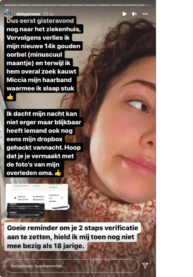 Verder ziet Daisy zelf in dat ze er ook van geleerd heeft, want als laatste zegt ze. "Goeie reminder om je 2 staps verificatie aan te zetten, hield ik mij toen nog niet mee bezig als 18-jarige".