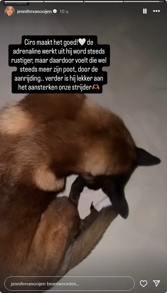 Jennifer deelt via haar Instagram beelden van de hond die met een verbonden achterpoot rondloopt. "Ciro maakt het goed!" schrijft zij erbij. "De adrenaline werkt uit, hij wordt steeds rustiger. Maar daardoor voelt 'ie wel steeds meer zijn poot, door de aanrijding. Verder is hij lekker aan het aansterken, onze strijder."