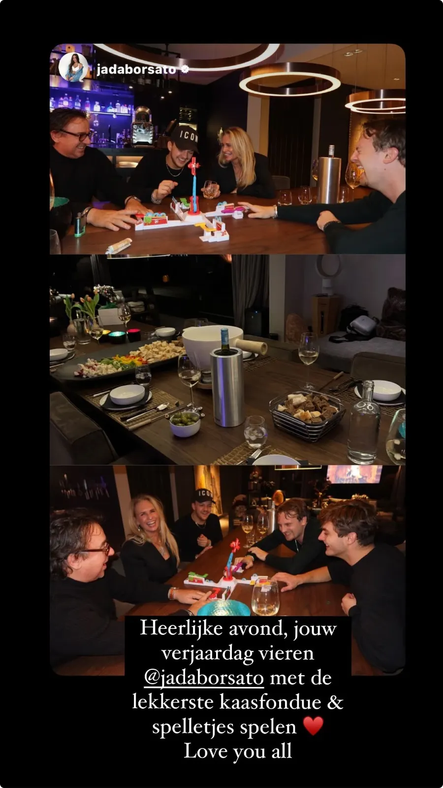 Ter gelegenheid van de 22e verjaardag van Jada Borsato staat er een heus feestmaal op tafel en ook aan speelplezier is geen gebrek. Leontine deelt de beelden daarvan in haar story. "Heerlijke avond, jouw verjaardag vieren met de lekkerste kaasfondue en spelletjes spelen. Love you all", schrijft ze bij dit liefdevolle bericht.