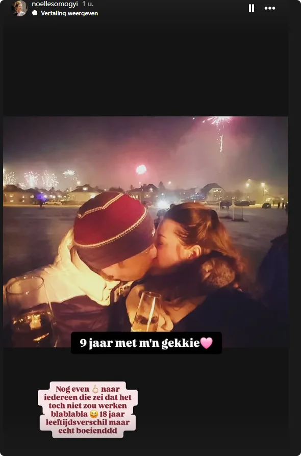 "Negen jaar met mijn gekkie", schrijft Noëlle bij een kussende foto met haar man. De twee ontmoeten elkaar voor het eerst in Volendam, Noëlle was toen 17 jaar en Ferri 35. Over dat verschil zegt ze: "Nog even een middelvinger naar iedereen die zei dat het toch niet zou werken, blablabla. 18 jaar leeftijdsverschil, maar echt boeiend."