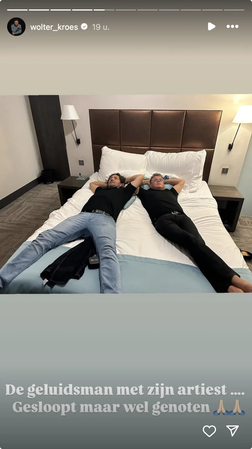 Op de foto liggen de zanger en zijn geluidsman samen op bed. Zo te zien zijn de twee duidelijk uitgeput van het werk. Bij de foto schrijft Wolter: "De geluidsman met zijn artiest… gesloopt maar wel genoten."