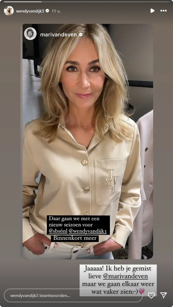 De presentatrice deelde de post van Mari ook op haar eigen pagina. "Jaaaa! Ik heb je gemist lieve Mari van de Ven maar we gaan elkaar weer wat vaker zien", meldt ze. Voor welk programma er opnames waren, is niet bekend.