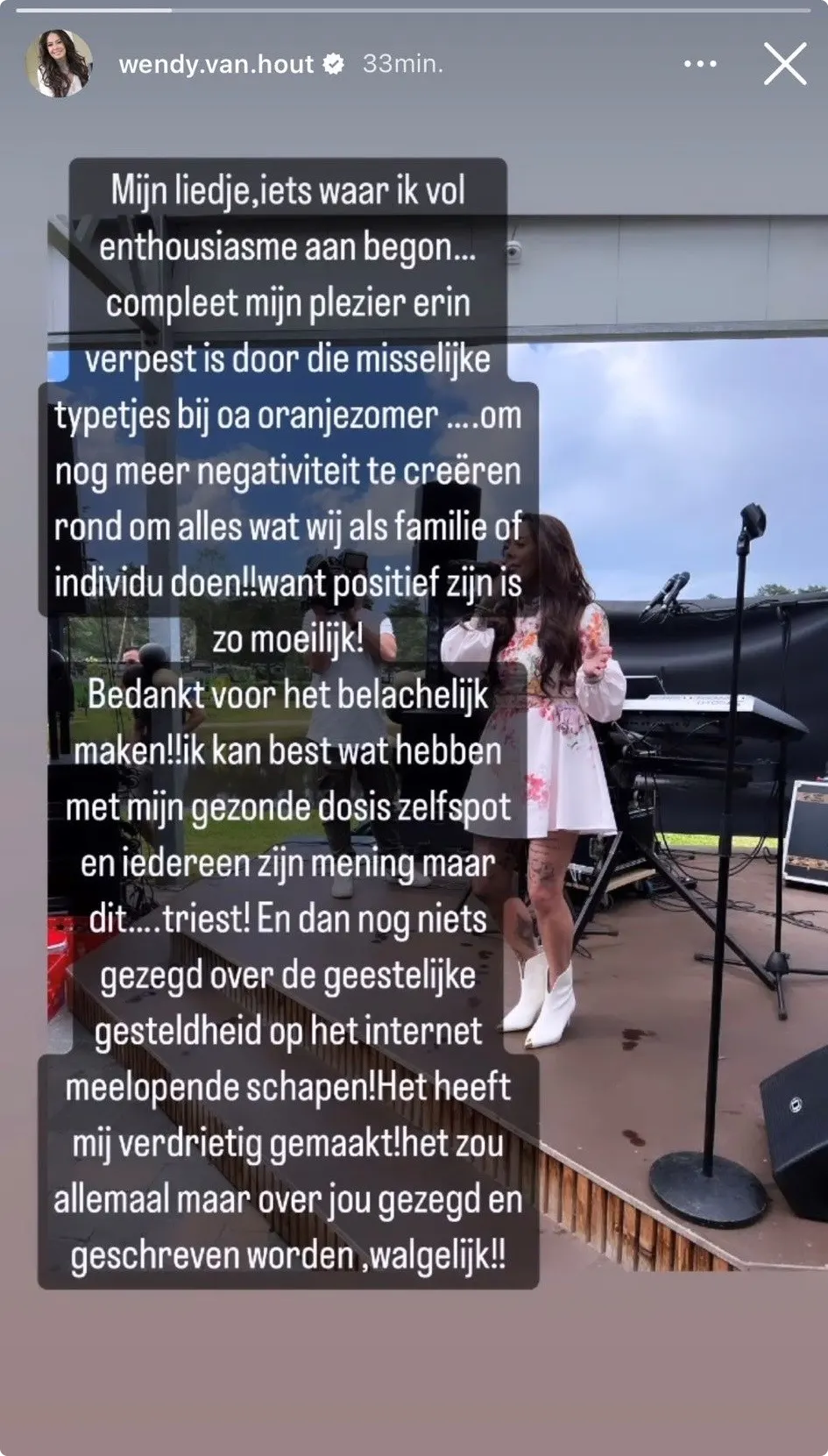 Wendy reageert daarop met: "Mijn liedje, iets waar ik vol enthousiasme aan begon. Compleet mijn plezier erin verpest is door die misselijke typetjes bij o.a. De Oranjezomer om nog meer negativiteit te creëren rond om alles wat wij als familie of individu doen. Want positief zijn is zo moeilijk!"