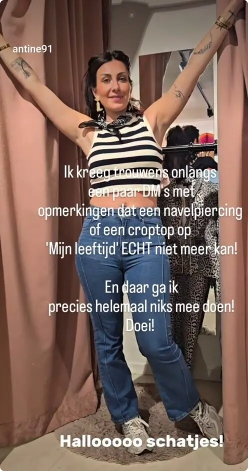 Maar haar volgers delen ook maar al te graag hun mening, laat de 32-jarige weten in een post. “Ik kreeg onlangs een paar DM’s met opmerkingen dat een navelpiercing of een croptop op ‘mijn leeftijd’ ECHT niet meer kan!”, schrijft ze op haar pagina. Toch lijkt ze niet onder de indruk van het commentaar. “Daar ga ik precies helemaal niks mee doen! Doei!”