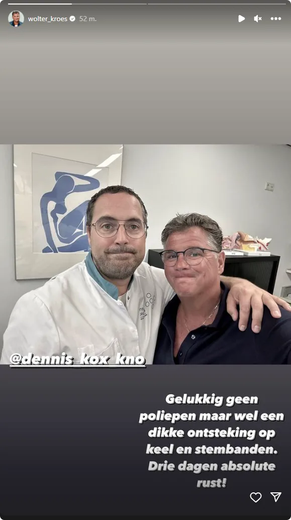 "Gelukkig geen poliepen, maar wel een dikke ontsteking op mijn keel en stembanden", schrijft Wolter bij een foto samen met de KNO-arts. De arts heeft laten weten dat de zanger drie dagen absolute rust moet houden.