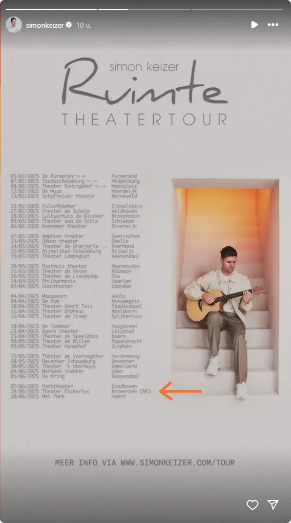 In een screenshot van zijn tourschema staat namelijk ook een internationale theaterzaal op de planning. Het gaat om Theater Elckerlyc in Antwerpen. De zanger gaat dus de grens over met zijn nieuwe muziek. In zijn laatste story deelt hij ook nog een link naar de website waar zijn fans kaarten kunnen kopen.