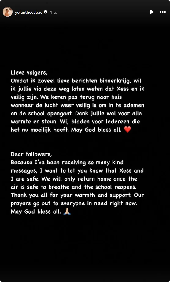 "Omdat ik zoveel lieve berichten binnenkrijg, wil ik jullie via deze weg laten weten dat Xess en ik veilig zijn", aldus Yolanthe in haar bericht. "We keren pas terug naar huis wanneer de lucht weer veilig is om in te ademen en de school opengaat. Dank jullie wel voor alle warmte en steun. Wij bidden voor iedereen die het nu moeilijk heeft."
