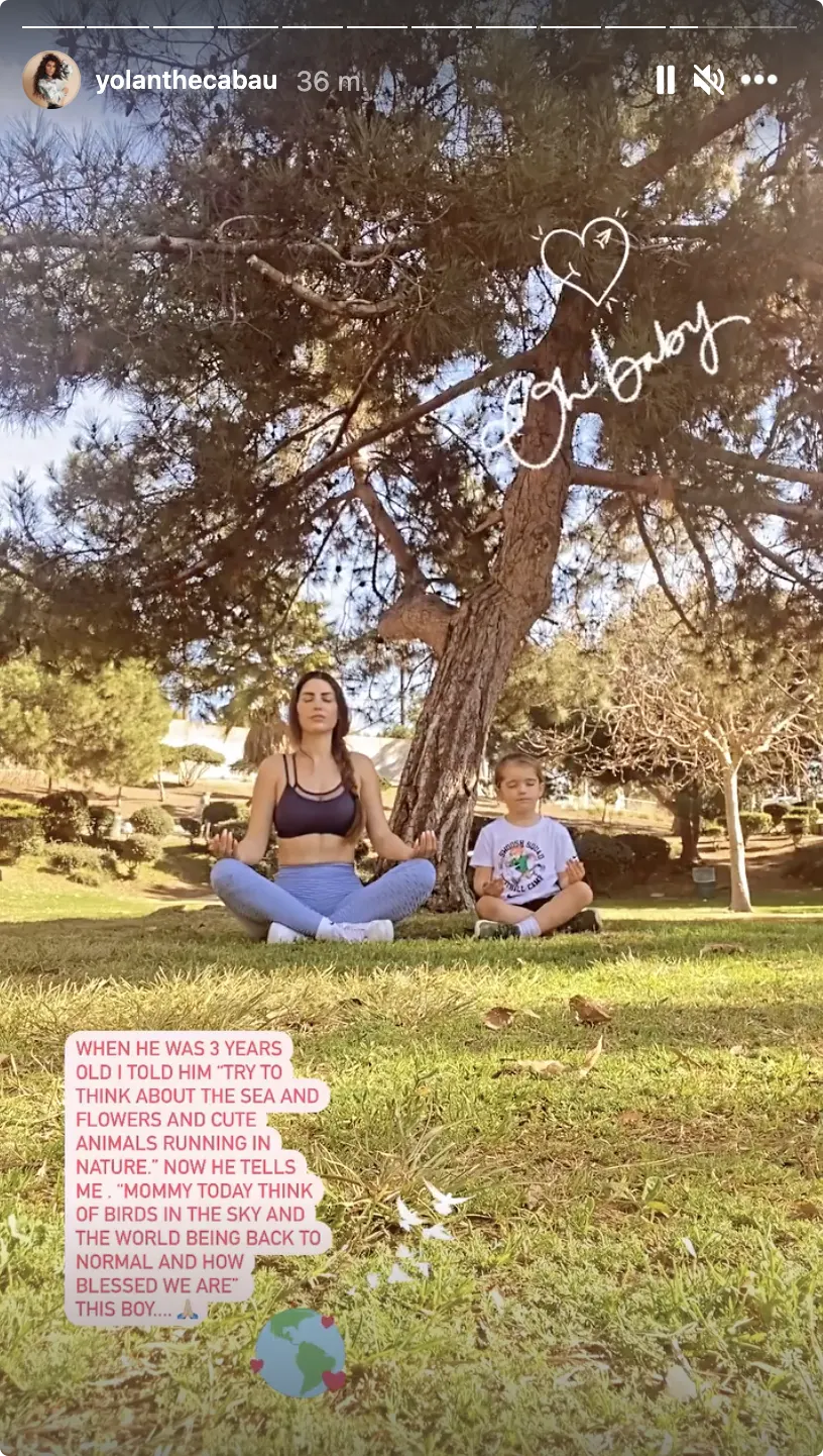 Verder laat de ex van Wesley Sneijder weten dat ze hem op driejarige leeftijd vertelde om aan "de zee, bloemen en schattige, rennende dieren in de natuur" te denken. Inmiddels denkt hij ook aan andere dingen: "Mama, vandaag denk ik aan vogels in de lucht en dat de wereld weer een beetje terug naar normaal is. En dat we gezegend zijn", sluit Yolanthe af.