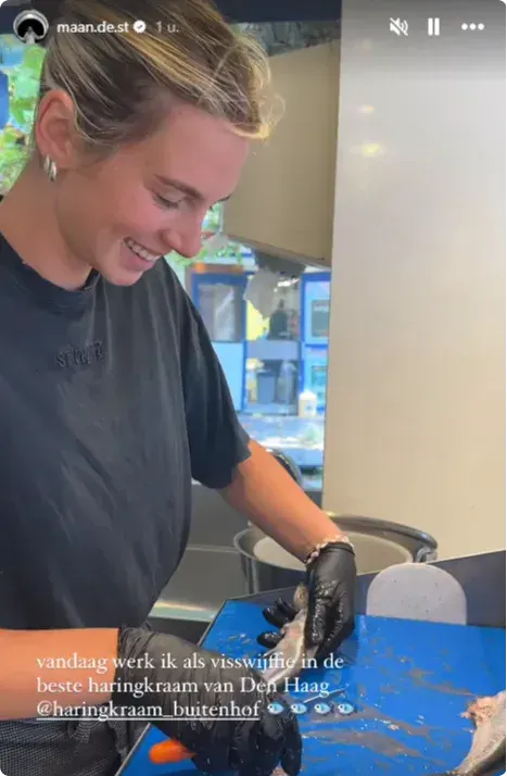 Maan deelt onderstaande foto in haar Instagram Stories en schrijft erbij: "Vandaag werk is als viswijffie in de beste haringkraam van Den Haag."