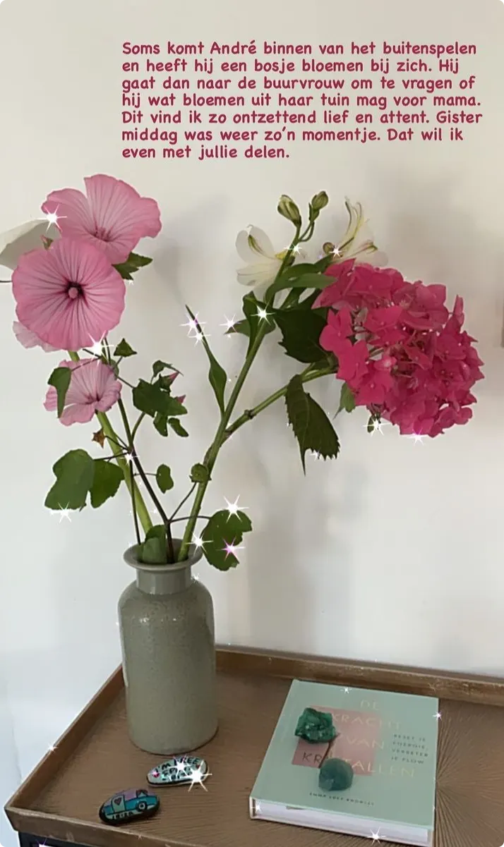 In haar Instagram Stories vertelt ze dat ze prachtige bloemen van haar oogappeltje heeft gekregen. "Soms komt André binnen van het buitenspelen en heeft hij een bosje bloemen bij zich. Hij gaat dan naar de buurvrouw om te vragen of hij wat bloemen uit haar tuin mag voor mama. Dit vind ik zo ontzettend lief en attent. Gistermiddag was weer zo'n momentje. Dat wil ik even met jullie delen", post Monique.
