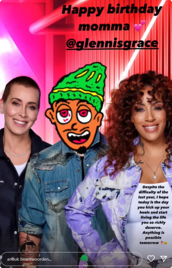 Anouks sneer is te zien in haar Instagram Stories, zie onderstaande screenshot, waarin ze in een emotionele verjaardagsboodschap Glennis een hart onder de riem steekt. Maar vooral de bewerkte foto van Waylon trekt alle aandacht. Zo is zijn gezicht onherkenbaar gemaakt en valt ook de zogenaamde Pinokkio-tattoo en de aubergine bij zijn kruis op.