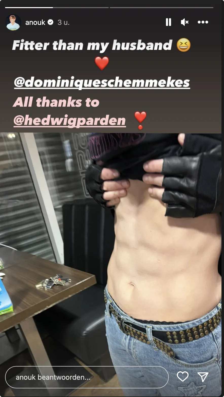 "Fitter dan Dominique", zo schrijft Anouk in haar Instagram Stories. De zangeres bedankt tot slot haar trainer. Te zien is dat ze aardig afgetraind is en al een flinke sixpack heeft.