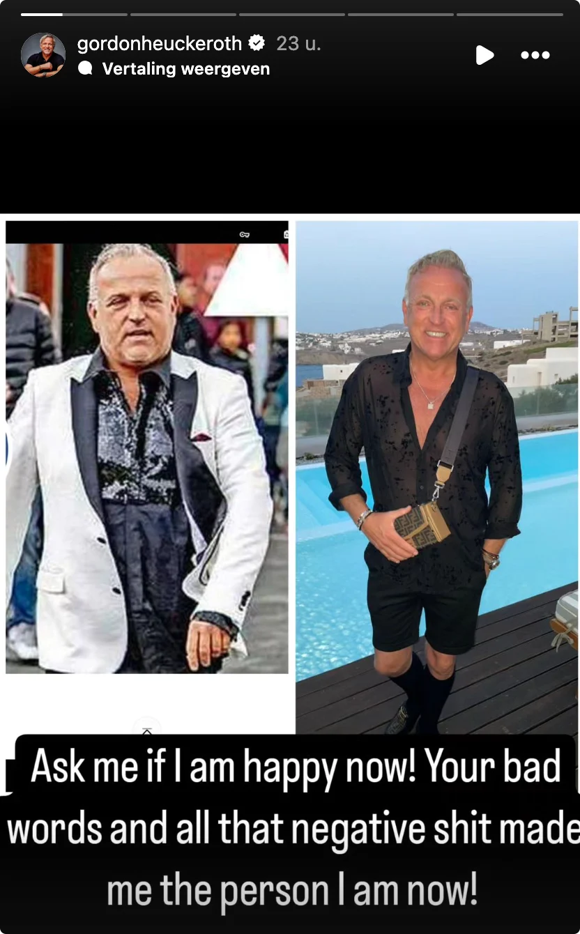 "Vraag me of ik gelukkig ben!" begint hij zijn bericht, bij een oude én nieuwe foto. "Jouw slechte woorden en al die negativiteit hebben me gemaakt tot de persoon die ik nu ben." In zijn Instagram-verhaal is te zien dat de zanger enorm is afgevallen.