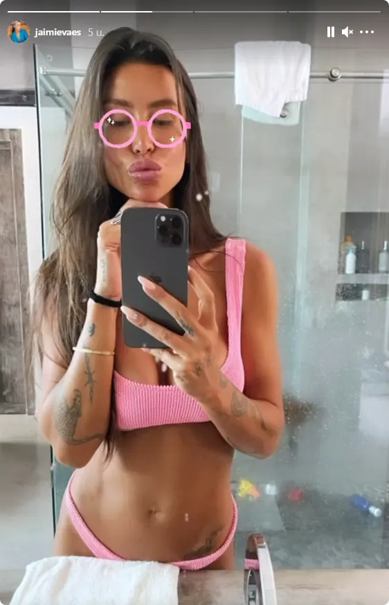 Op Instagram deelt ze een foto van zichzelf in een roze bikini voor de spiegel.