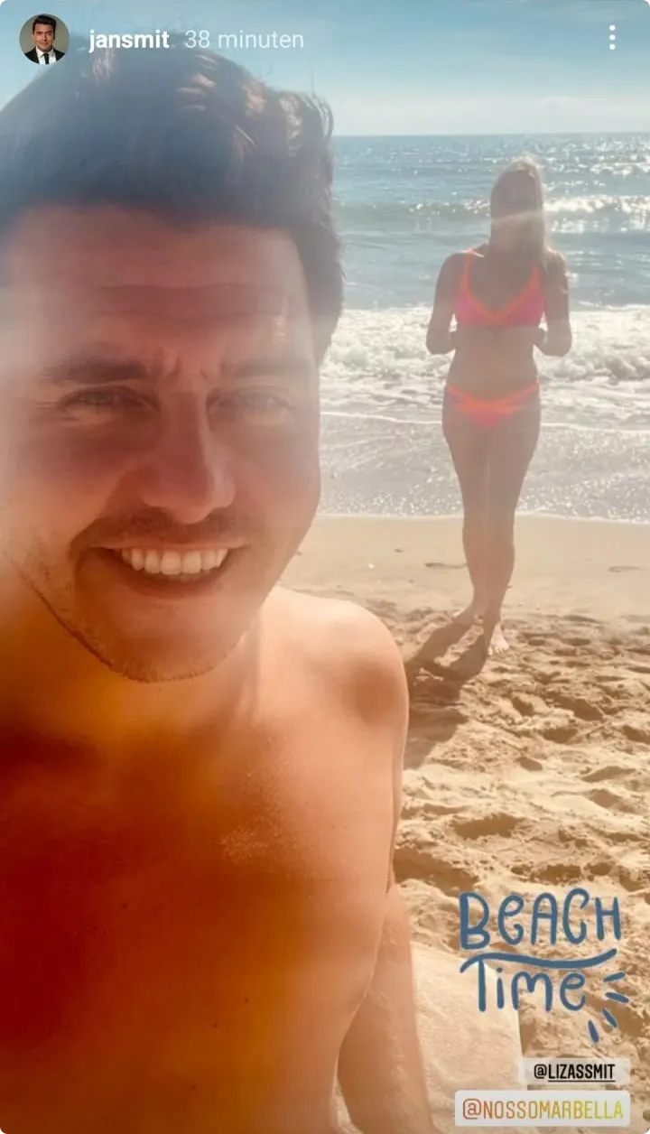 Jan Smit is op vakantie met zijn vrouw Liza. Op Instagram deelt hij een jaloersmakende foto met zijn vrouw op het strand...