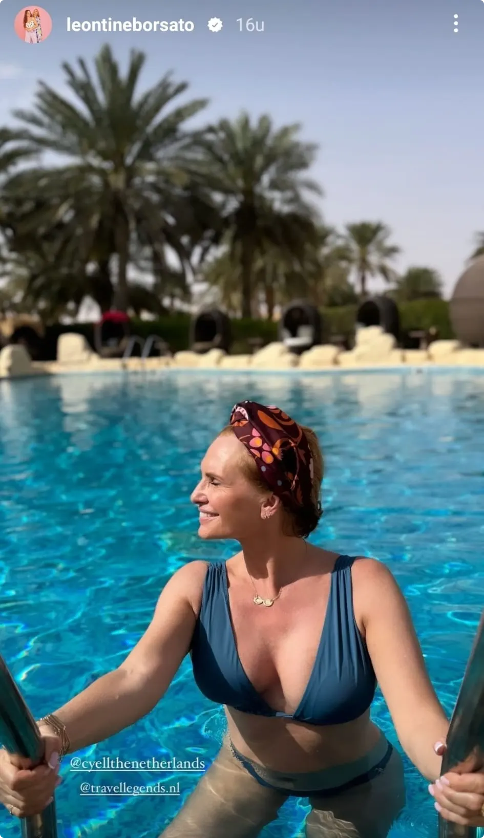 Leontine heeft een foto gedeeld waarop via een trapje het zwembad uitklimpt. Ze heeft verder nog een bandana om en lijkt het naar haar zin te hebben.